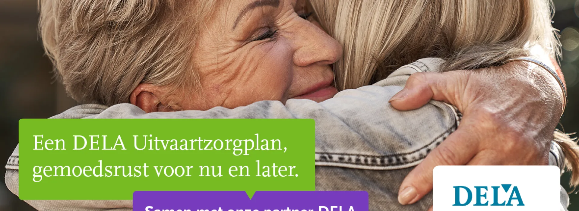 DELA Natura- en levensverzekeringen N.V. – Belgisch bijkantoor (ondernemingsnr. 0665.931.229) gelegen te Noorderplaats 5 bus 2 te 2000 Antwerpen, bijkantoor van DELA Natura- en levensverzekeringen N.V., vennootschap naar NL recht (KvK-nummer 17078393), gelegen te Oude Stadsgracht 1, 5611DD Eindhoven, NL, toegelaten voor Tak 21 levensverzekeringen onder codenr. 2864; fabrikant DELA Uitvaartzorgplan, levensverzekering Tak 21 onderworpen aan BE recht – dekt levenslang uw uitvaartkosten voor het bedrag waarvoor u verzekerd bent. Men is niet gedekt voor een overlijden dat het gevolg is van een uitgesloten risico, met name zelfmoord binnen het jaar na de inwerkingtreding van de polis; vrijwillige deelname aan collectieve gewelddaad/terreur of oorlog (professionele omstandigheden [bv. militairen, politie, brandweer] uitgezonderd); misdaad of wanbedrijf indien men deze als (mede)dader pleegde. Voor extra bijstand, psychologische bijstand, repatriëring & vervroegde terugkeer gelden specifieke beperkingen en uitsluitingen. Deze vindt u terug in de Algemene Voorwaarden. Offerte, premieberekening en Algemene Voorwaarden: www.dela.be en/of uw makelaar. Klachten: contact@dela.be of Ombudsman Verzekeringen (de Meeûsplantsoen 35, 1000 Brussel). Indien u kosteloos een kopie wenst van de Algemene Voorwaarden, gelieve een e-mail te richten aan info@dela.be. Aan deze tekst kunnen geen rechten worden ontleend. Enkel de Algemene en Bijzondere Voorwaarden zijn bindend.
